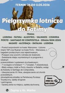 UWAGA!Osoby zapisane na pielgrzymkę do Portugalii zapraszamy na spotkanie organizacyjne 29.03.2026r. (niedziela Palmowa) o godz.16.30 w kościele w Grabówce. Podczas spotkania wpłacamy pozostałą kwotę razem z euro.