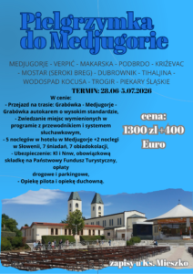 UWAGA! Osoby zapisane na pielgrzymkę do Medjugorie prosimy o wpłatę zaliczki 1300zł do 22.03.2026r.